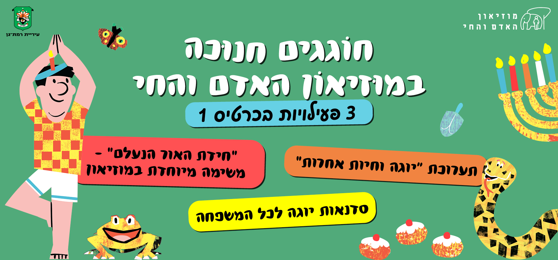 במהלך חג החנוכה יתקיימו בכל שעה עגולה סדנאות יוגה וגמישות חינם לכל המשפחה.